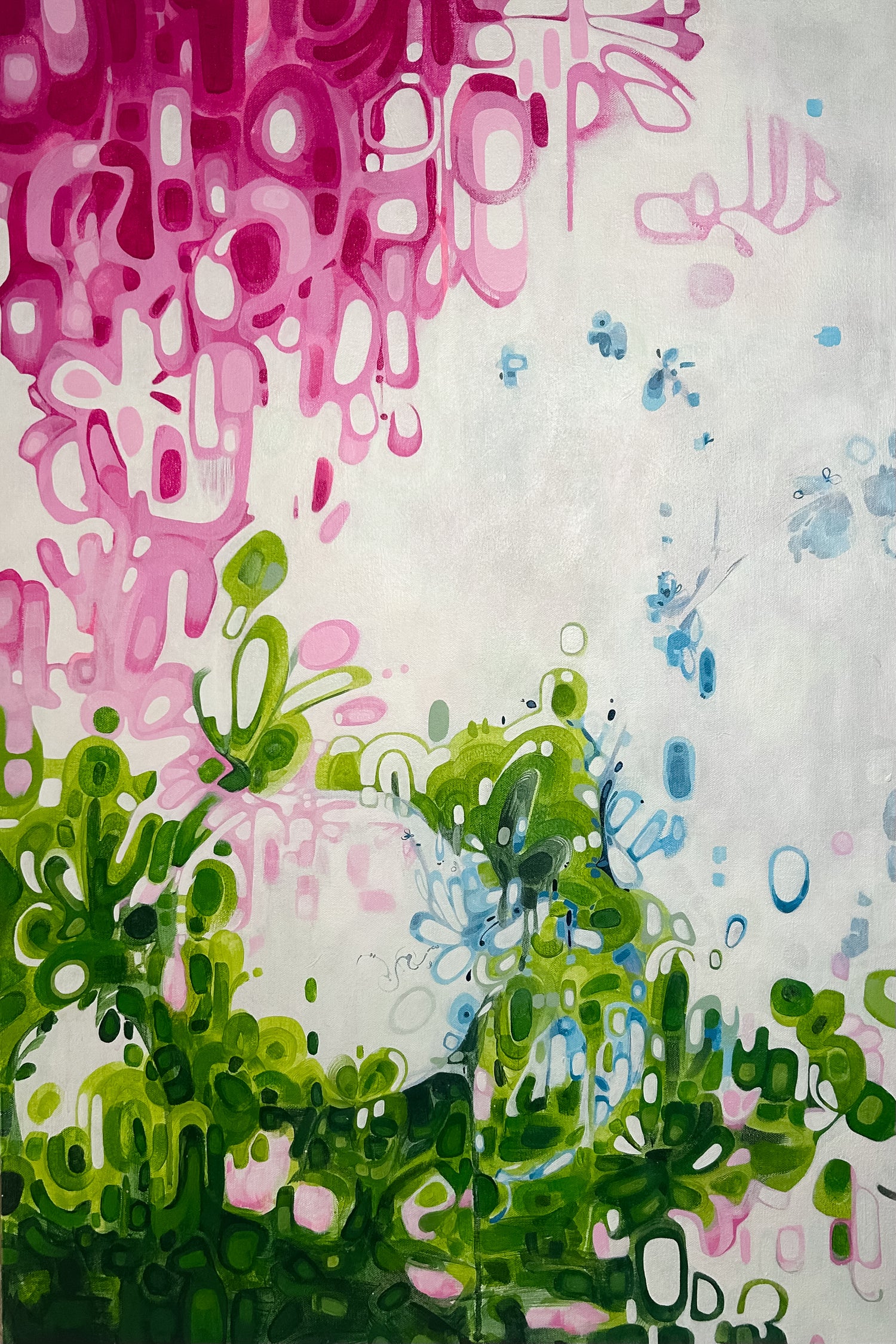 Esta fue sin duda una experiencia de aprendizaje para mí: de mi arte, mi mente y de mí misma. Decidí alejarme de mi hábito de perfeccionismo y planificación insoportables, y dejarme llevar por mi intuición. Me arriesgué a ser más desordenada, caótica e impredecible en mi proceso artístico que nunca. Aquí se refleja mi objetivo de manifestar mi mundo espiritual interior más que en cualquier otra cosa que haya creado antes. Se parece a mí. Es aquí donde recuerdo quién soy. Ejercité mi intuición a un nuevo nivel y trabajé con el lienzo de forma espontánea. Fue más una colaboración que una creación unilateral. Por lo tanto, se creó con más profundidad, autenticidad y amor, lo cual se refleja en la pieza final. Durante la creación de esta pieza, y en comunicación con la artista (y mi profesora) Robyn Cumming, aprendí que mi idea de la belleza está distorsionada. Creía que la belleza tenía que ser limpia, organizada y "perfecta". Como mi arte es una extensión de mí, esta noción de belleza se tradujo en cómo me veía a mí misma. Fue increíblemente liberador tomar conciencia. De esto, y de ver cómo la belleza (especialmente en mi principal inspiración física, la naturaleza) suele ser enredada, desordenada, heterodoxa, caótica y salvaje. Pero quizás esto signifique que es libre.