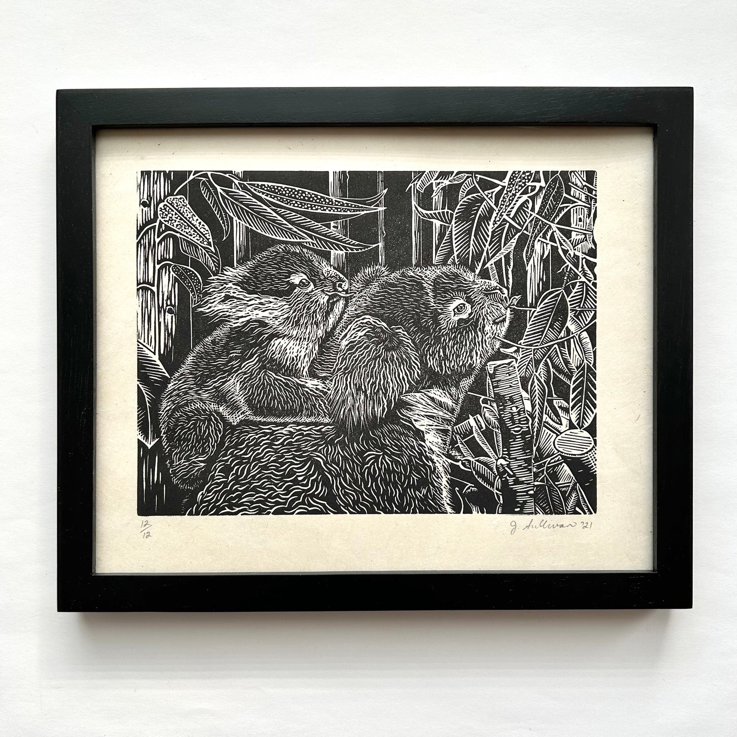This charming linocut print captures a koala in striking black and white detail, showcasing the intricate linework that brings the beloved marsupial to life. Each original print is a testament to the artist's skillful hand-carving technique, revealing fine textures and expressive character in every stroke. Perfect for animal lovers and art enthusiasts alike, this piece adds warmth and personality to any space while celebrating the beauty of traditional printmaking.