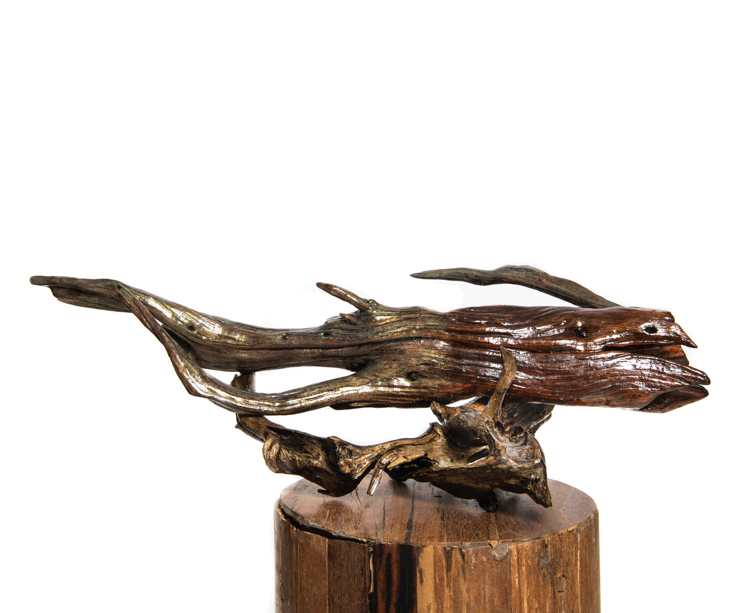 Peces esculpidos en madera flotante de cedro tallada a mano, esta pieza se asienta sobre una base de cuna de madera flotante. Ambas piezas están acabadas en barniz exterior, no se recomienda dejar esta pieza en el exterior.