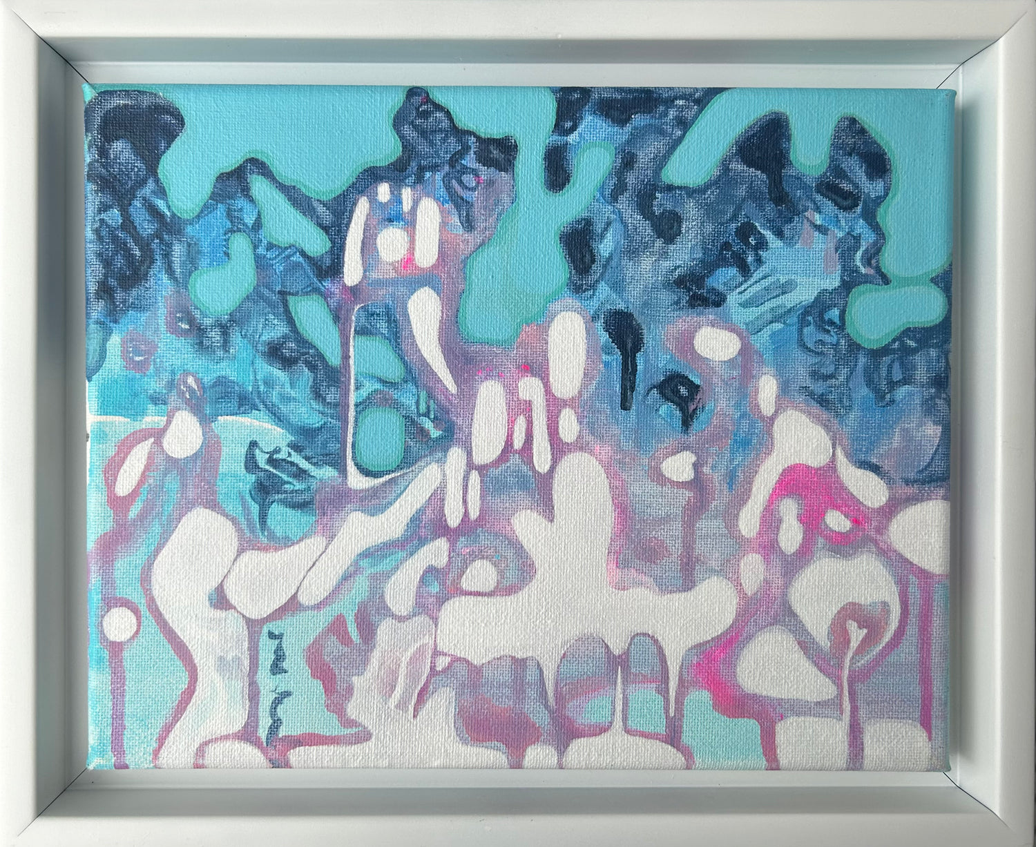 Acrílico sobre lienzo, enmarcado en marco flotante blanco.