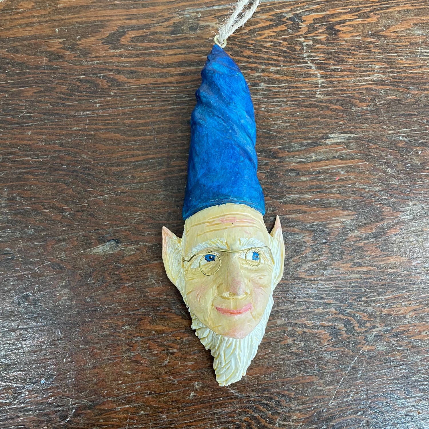 Hand Carved wood ornament, with metal glasses. Hand painted.