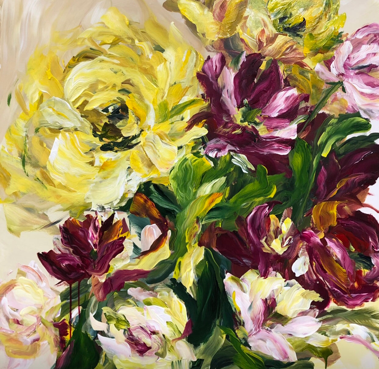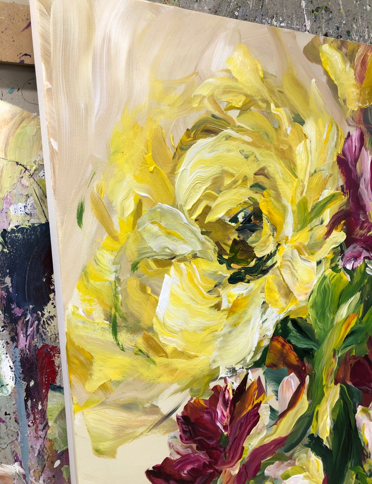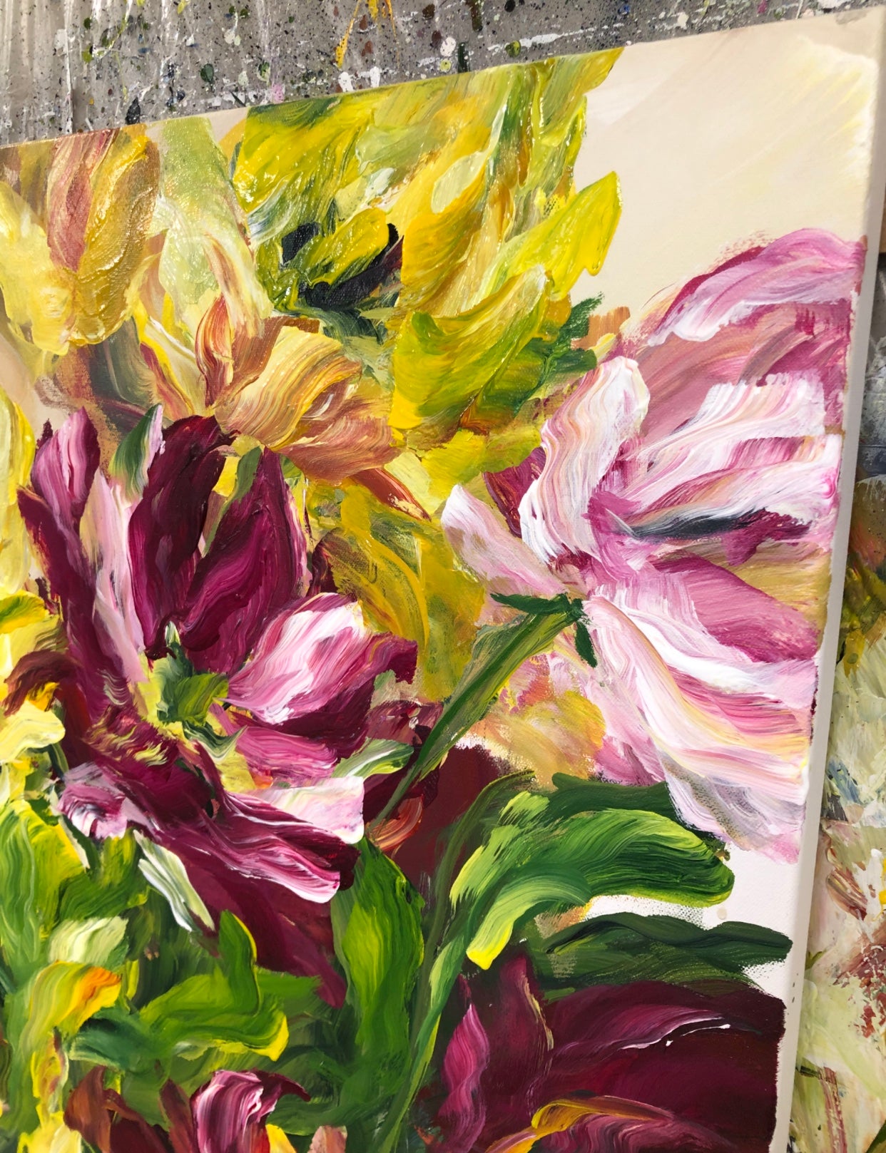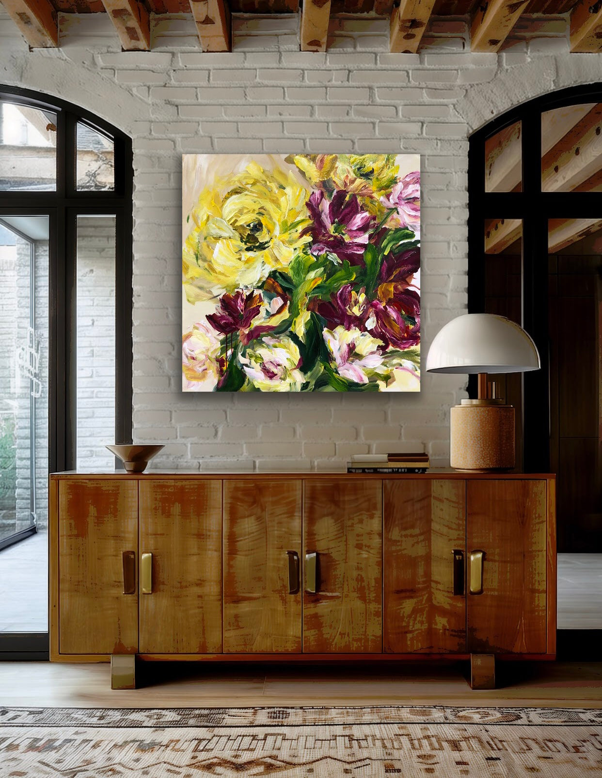 Get ready to be mesmerized by Forget Me Not, a large scale painting by Denise Lini. With vibrant acrylic colors and delicate flower details, this piece will add a pop of color to any room. Don't forget to stop and admire its beauty!