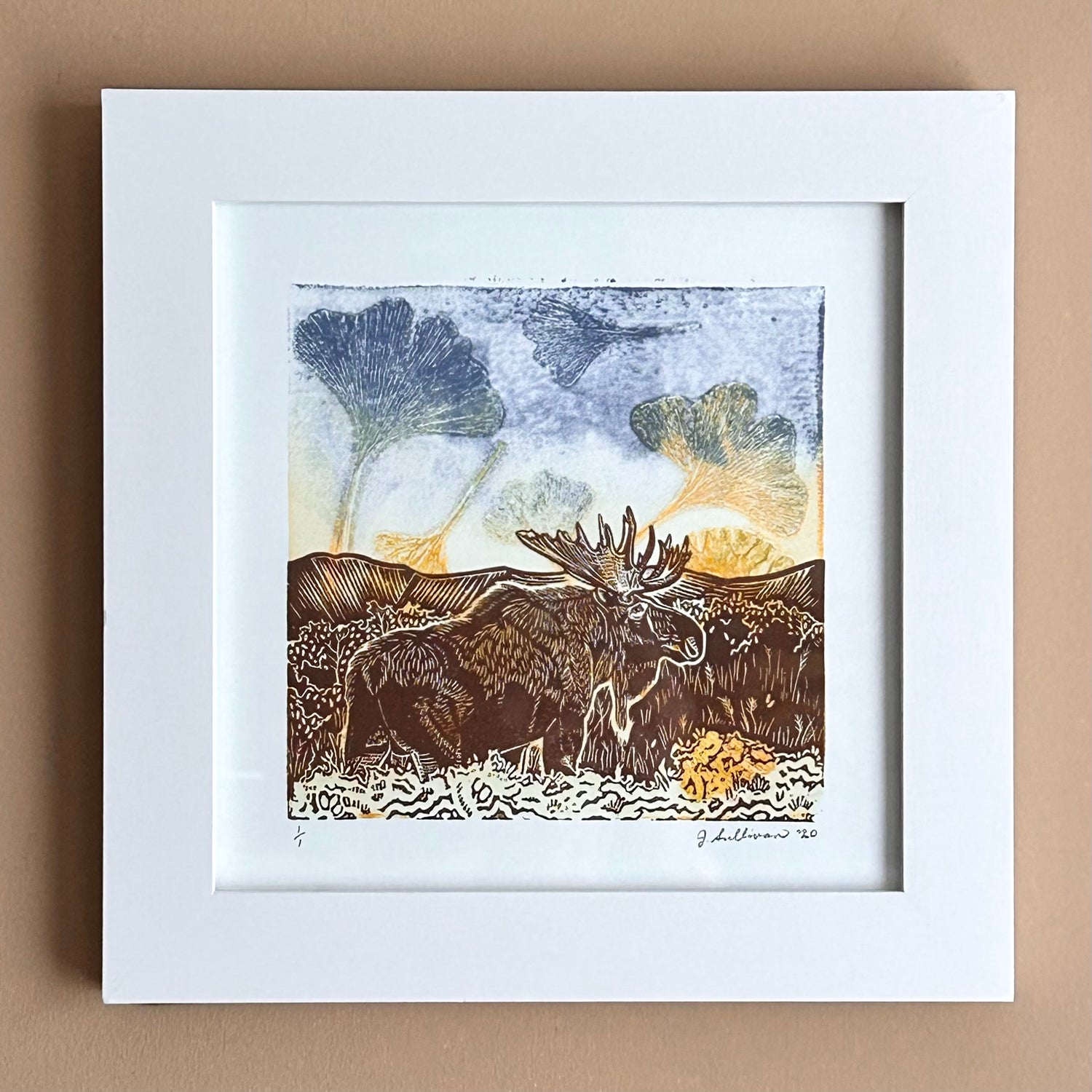 Behold the majestic moose—carved with bold, confident lines and brought to life through lino cut artistry. This one-of-a-kind print features a striking gingko leaf gelli print backdrop in vibrant, multi-coloured hues that dance behind the iconic silhouette. Each impression is unique, making this a truly singular piece of art. Perfect for nature lovers and print enthusiasts who appreciate handcrafted character and artistic flair.