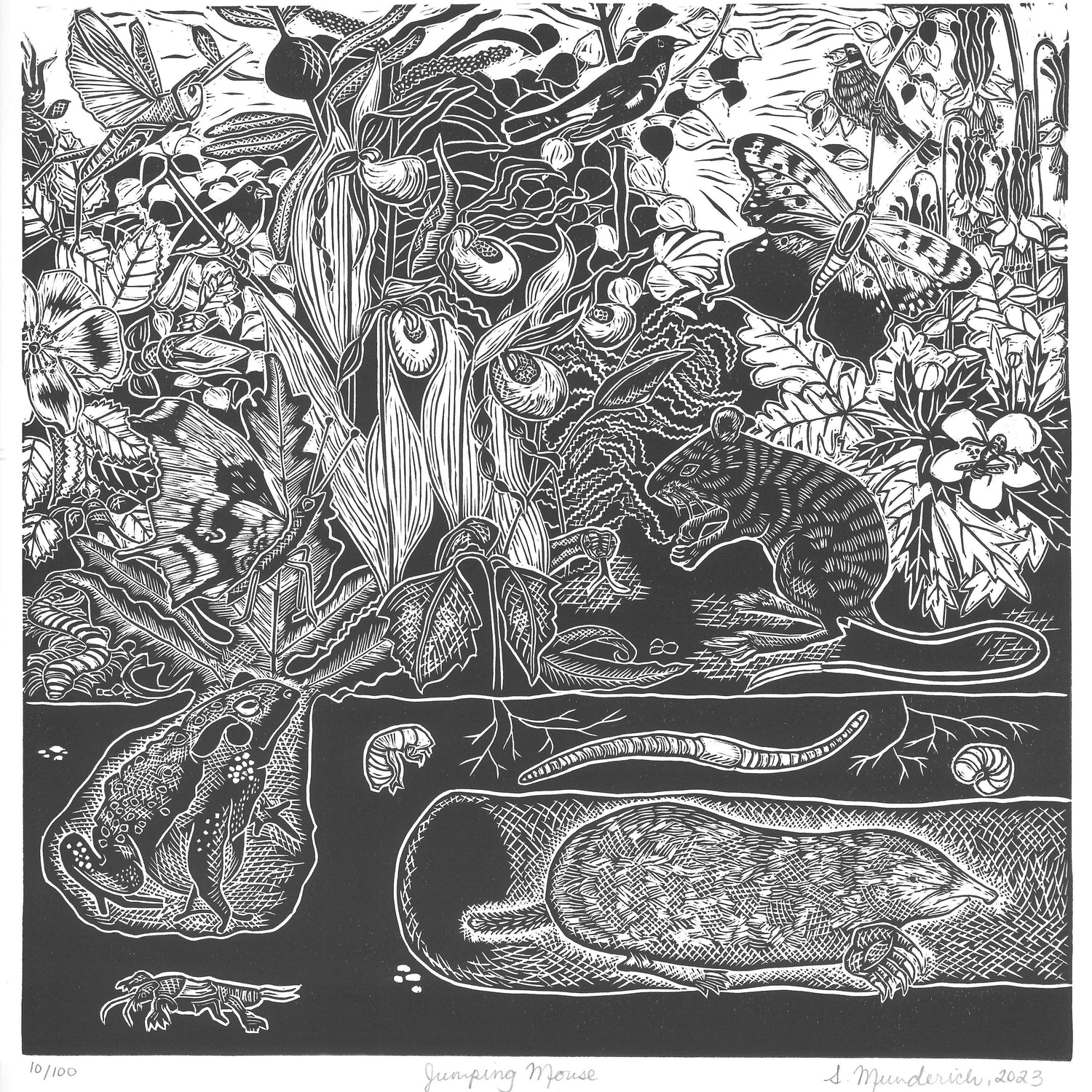 After several decades spent as an art educator supporting others in their creative endeavours, Susan Munderich began her own artistic practice as a printmaker in 2021. Her first print, Pine Creek Spring, was created as a thank you gift for City of Pickering officials, conservation workers, and all those who contributed to the preservation of a local beaver family’s habitat. Since then, she has experimented with a variety of relief printmaking techniques including reduction, multi-block, and jigsaw. Alongside her limited editions, Susan also creates linocut illustrations for the nature books she writes, detailing the characteristics and behaviours of local creatures.